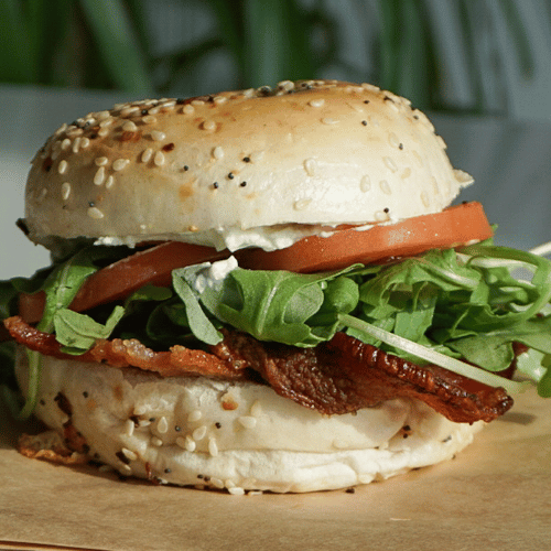 Classic BLT with applewood smoked bacon, juicy tomatoes, and spinach. Served with choice of bread, bagel or flour tortilla. Cream cheese or garlic aioli