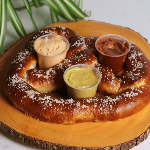 Famous Blake's Party Pretzel. Served with dipping trio: Honey Sriracha Cream Cheese | PB & J | Spicy Brown Mustard