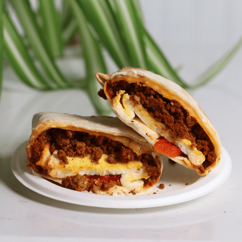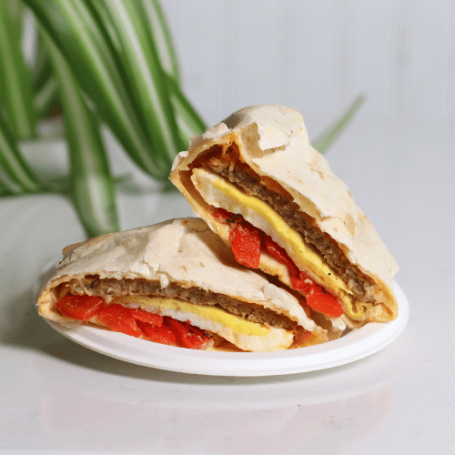 A traditional breakfast wrap. Fried egg | Turkey Sausage | Cheese | Cream Cheese | Flour Tortilla.