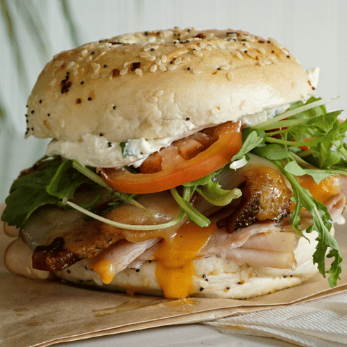 Ham, turkey, bacon, cheddar and monterey jack stacked high with spinach and tomato. Served on choice of bagel, bread or flour tortilla. Choice of cream cheese or Aioli