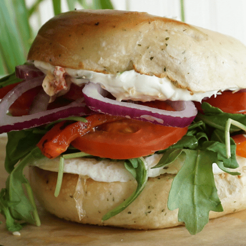 Roasted red pepper, red onion, tomatoes, and spinach. Served on choice of bagel, bread or flour tortilla. Choice of cream cheese.